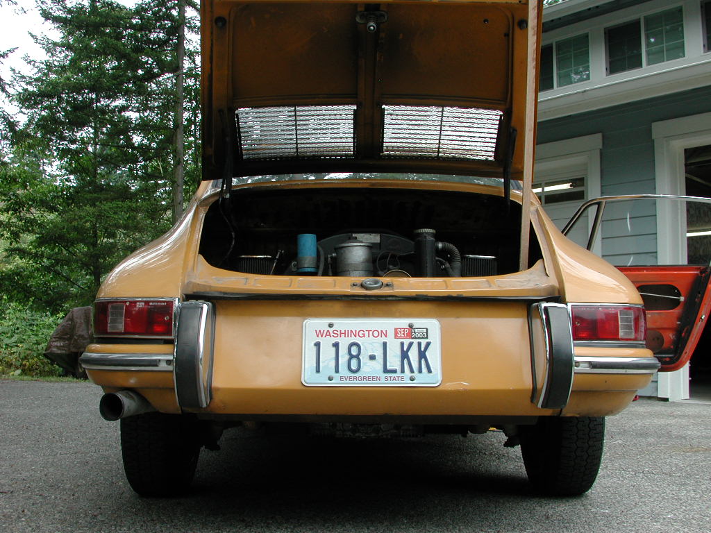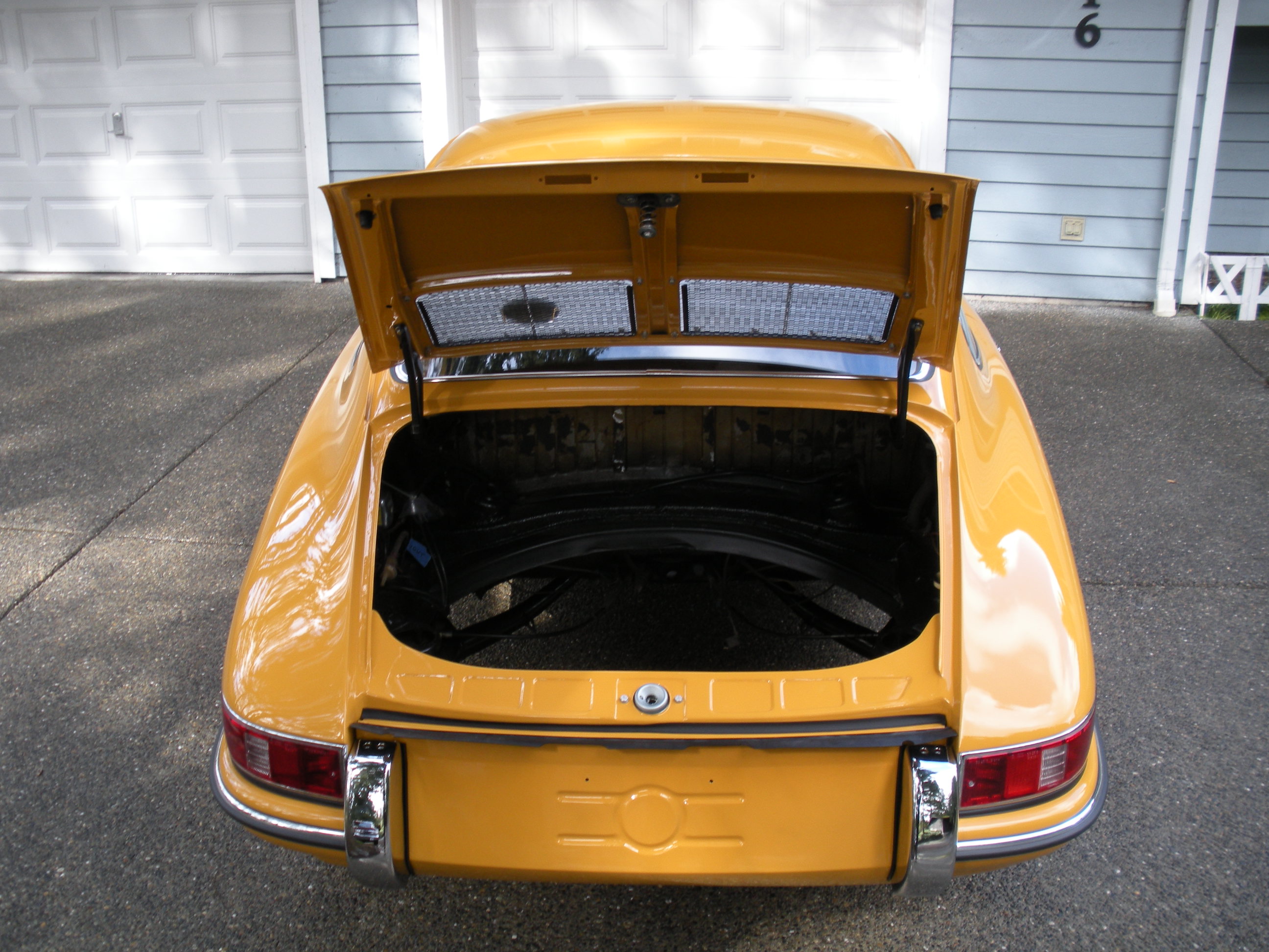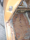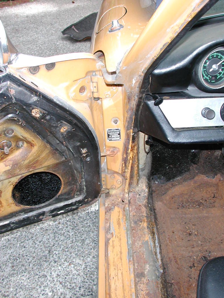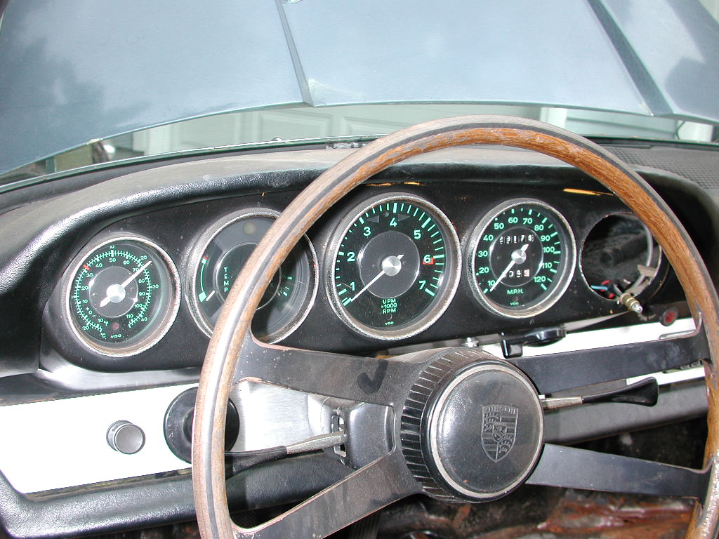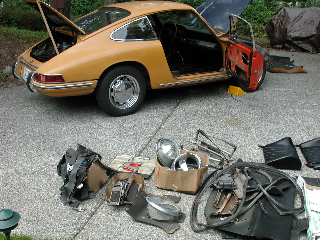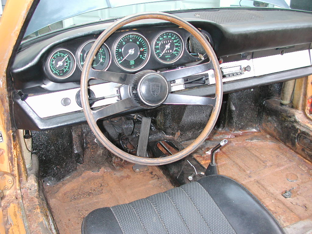Entry: 7/11/05 - You've got to be wondering what I was thinking when I bought a car with this much rust in it! I looked this car over many times and saw that the rust was only in water pooling areas and not the more insidious type caused by winter road salt. I wanted to try my hand at sheetmetal fabrication, invest in a better MIG welder and teach myself the craft using this car as a learning tool. My basic thoughts were if the bodywork turned out really good (those pictures follow), I would take this restoration to a higher level than just driver. Little did I know that I would eventually challenge myself to learn Super-90 engine rebuilding as well. These are the photographs I took of my 912 the day it was towed home from Ballard. I was using my old 3.4 megapixel Nikon digital camera so the photographs at 1024 x 768 pixels came out somewhat smaller than my current camera. I tried to focus on documenting the areas needing rust or collision repair and show the problems with door gaps and such. The interior of the car was already stripped out so assessment of the rust in the car was easy to do and I was very pleased by the quality of the original chrome, glass, instruments and toolkit. I was looking for a project to develop my sheetmetal fabrication skills with and decide if tackling a 356 Porsche restoration on my own would be a realistic. I love the early 912 and its almost identical materials and finish it shares with the last of the 356C model manufactured in parallel with it in Zuffenhausen at the time. Since then I have found and purchased an extremely well-preserved 1964 Porsche 356C and plan to restore it after finishing this 912.