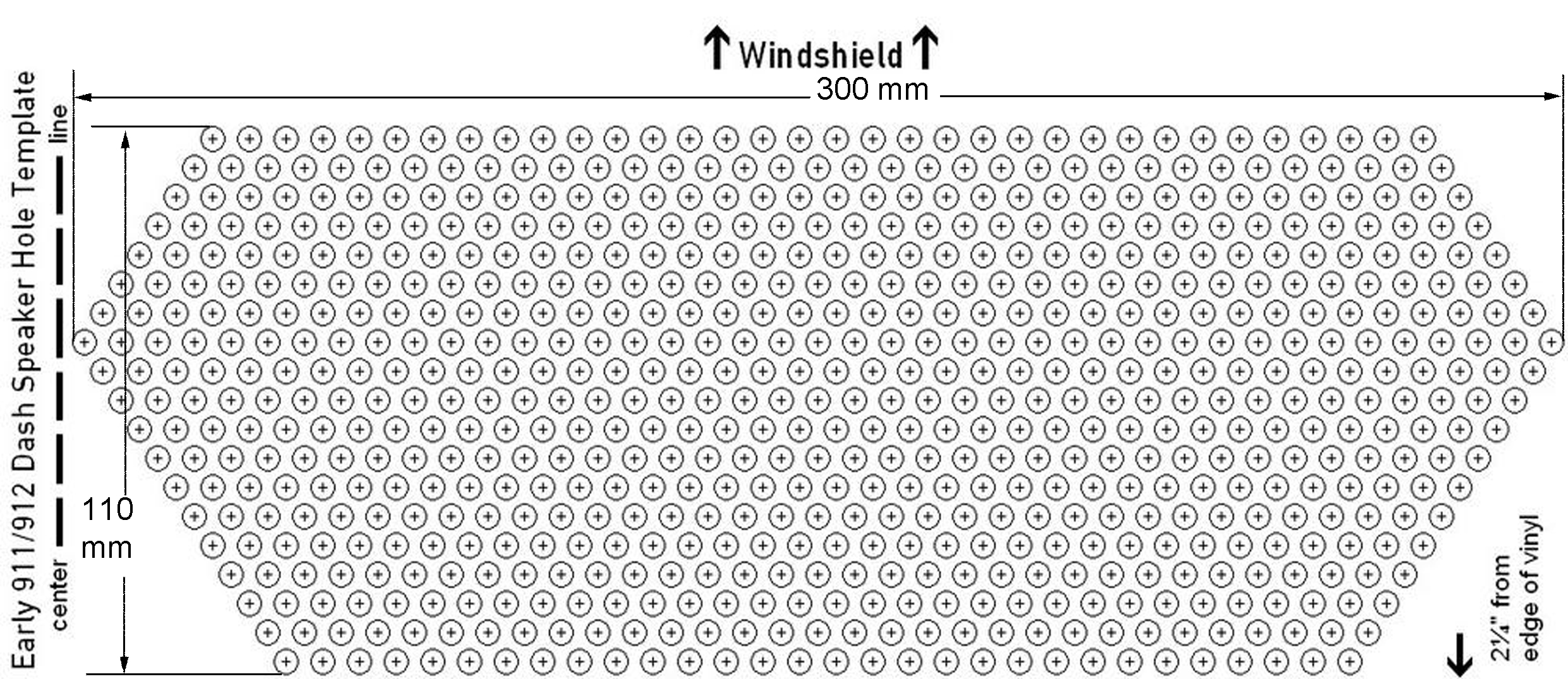 Entry: 11/11/08 - I've been working on a solution to reproducing the original radio speaker grill holes in the dash pad and thanks to my 912 buddy Matt, I was able to use some aluminum foil to take an impression of the original one in his car. From the impression I was able to draw a perfect pattern using the Windows "Paint" program on my computer. Now all I have to do is figure out how to use the pattern to actually put the holes in the vinyl, my current thinking is drill holes in a piece of sheetmetal to form a template for a gasket making hole punch. I'll wait until I talk to Steve Shepp to see what his thoughts are. I also just got off the phone with Maurice at Stoddard's and the German-made Sekurit brand clear (non-tinted) windshield has been ordered at my 10% discount and should arrive by the end of the month. You can see the full-size speaker grill hole template (recently updated for use with current printing technology with the help of my buddy Bill Sargent) by clicking on the smaller one below: