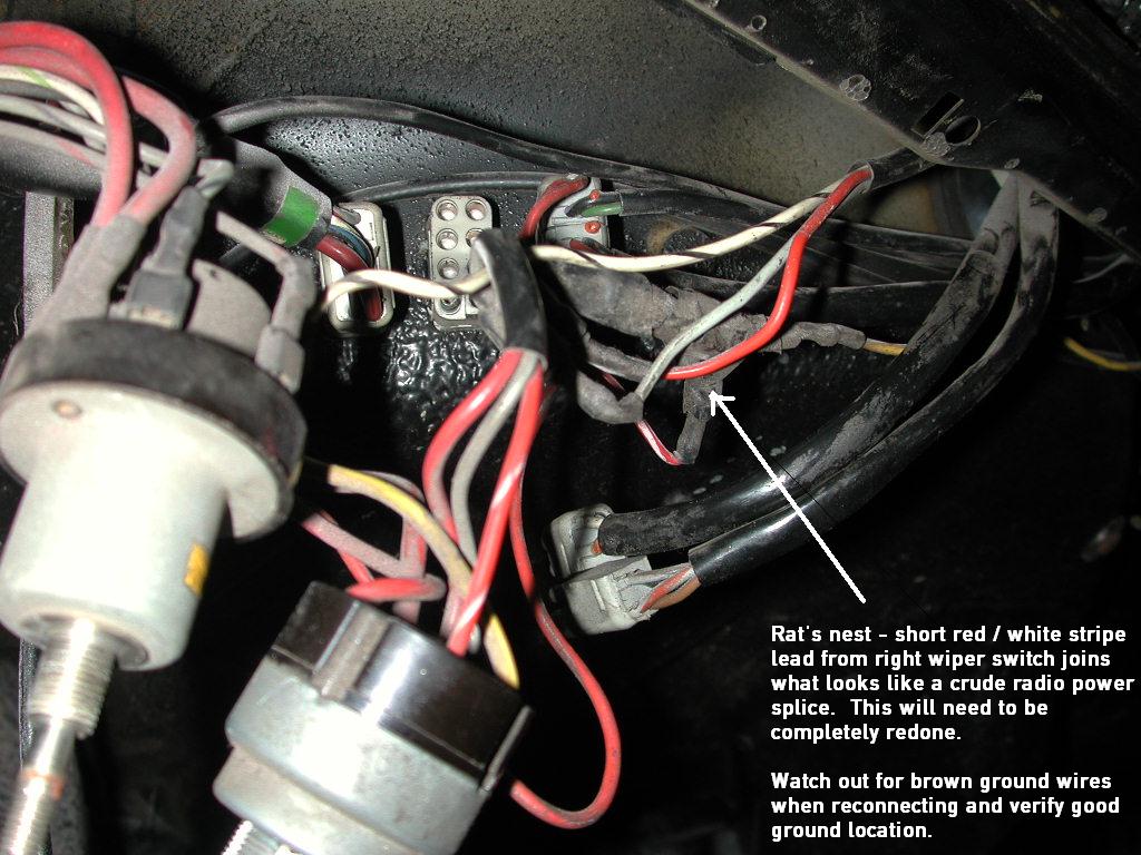I was able to remove all the wiring hacks for stereos and such made by prior owners and put everything back to exactly as it was from the factory. I made certain to use a wire brush on my Dremel tool to clean the bayonet-type spade connector welded to the dash so an excellent ground was insured prior to coating the connections with dielectric grease to keep them from corroding for a long time.